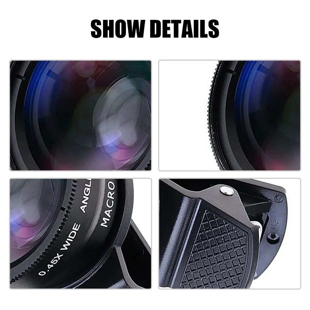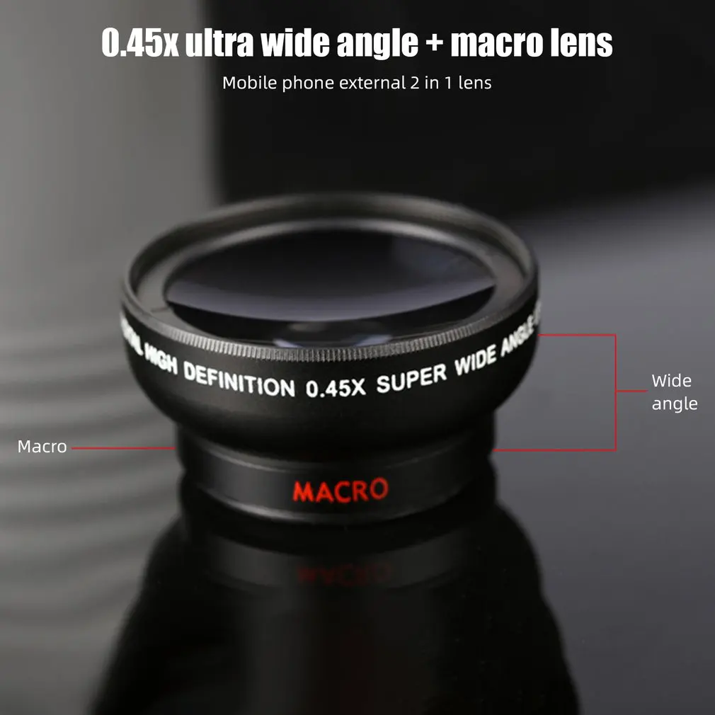 This is a 2-in-1 external lens of super wide 0.45x wide angle lens and 12.5x macro lens, made of aero-grade aluminum and optical glass, providing clear Image and microscopic photography, suitable for most smartphones, tablets with camera diameter smaller than or equal to 13mm.