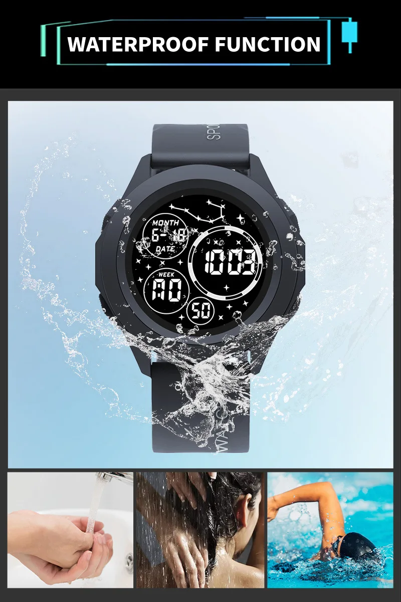 Fonctions de la montre électronique: chronomètre, réveil, rappel horaire, lumineux, affichage de la date, affichage de l’heure, affichage de la semaine, conversion de 12/24 heures, étanche